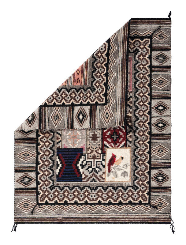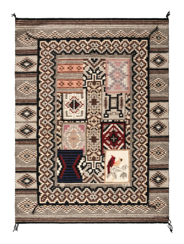 finely woven and designed with eight samplers "placed" on a Two Grey Hills which is "placed" on a Crystal pattern; Two Grey Hills has additional corner ties giving the illusion of stacked textiles; initialed lower right
