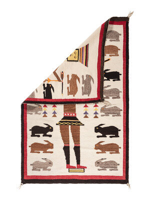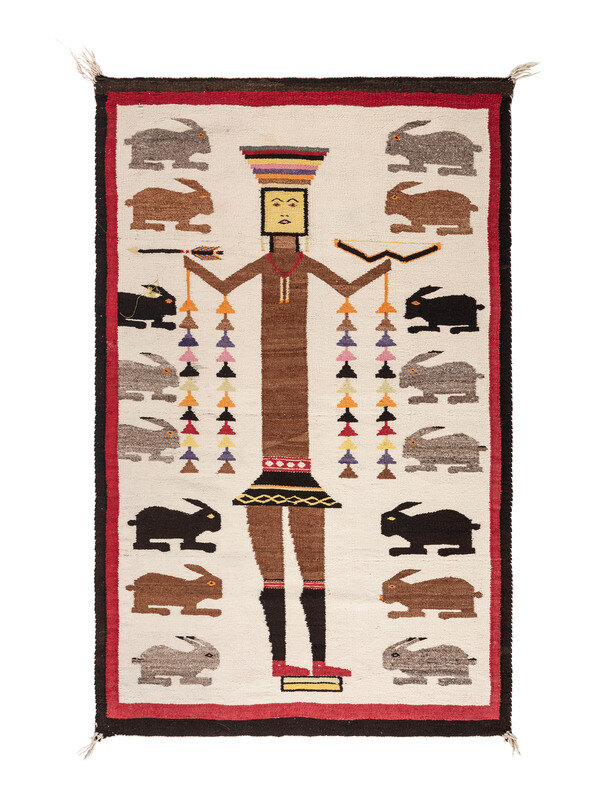 handspun wool woven using colors of grays, browns, yellow, purple, pink, green, and red; central Yei is surrounded by 16 rabbits