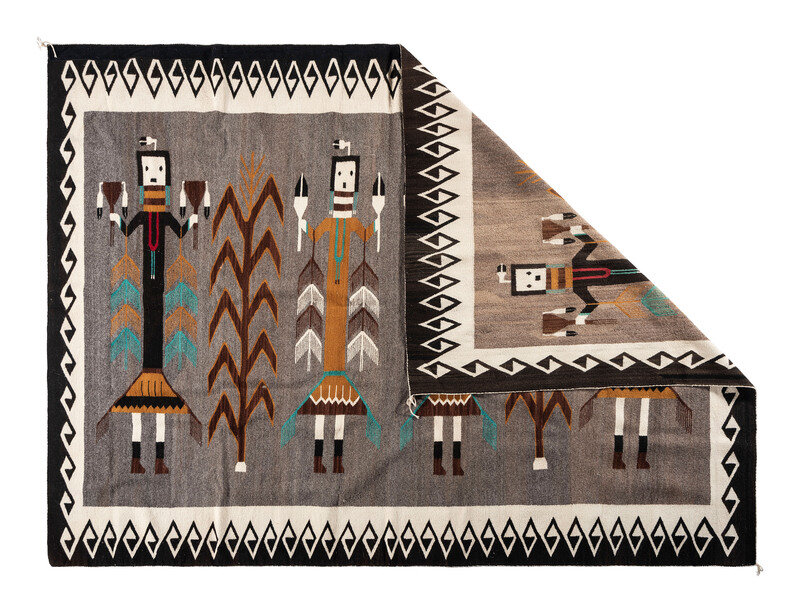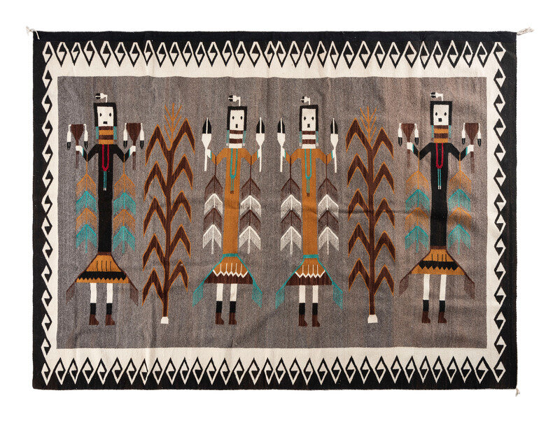 handspun wool woven with colors of cream, dark brown, turquoise, red, and tan; having four Yei and two cornstalks