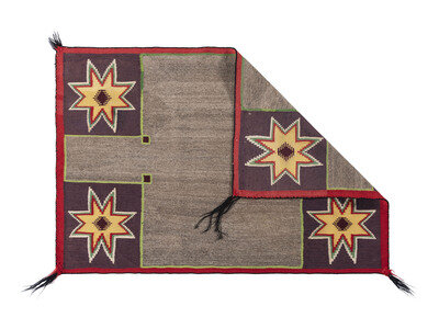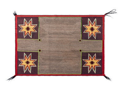 handspun gray ground with four Valero stars woven in Germantown colors of red, green, yellow, purple, and plum