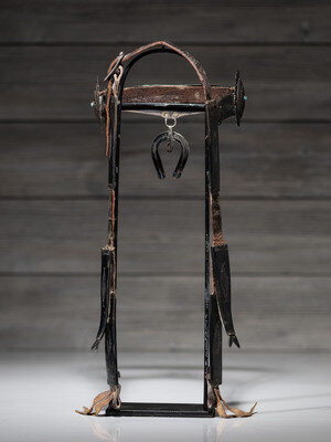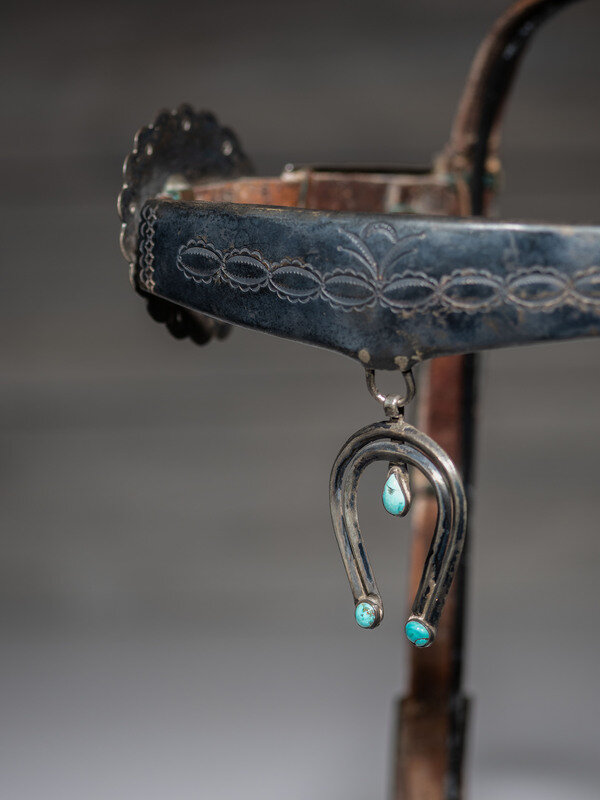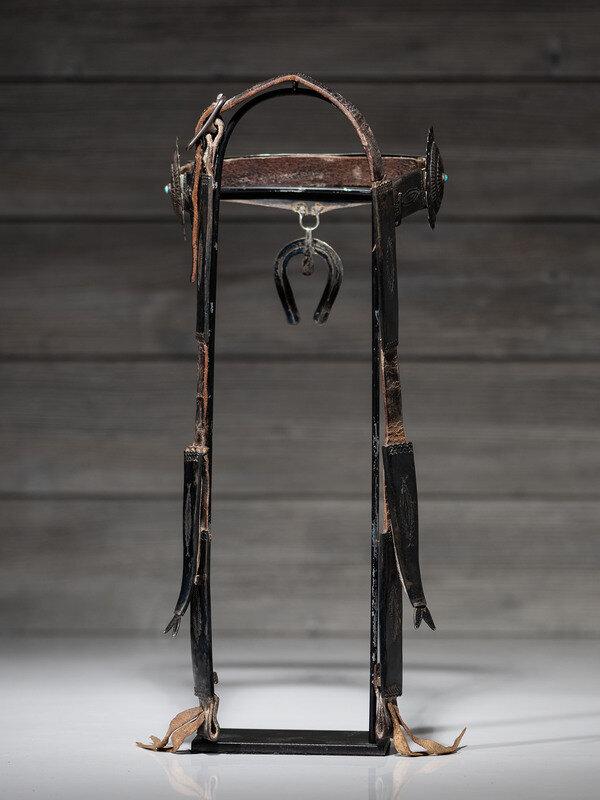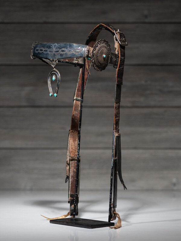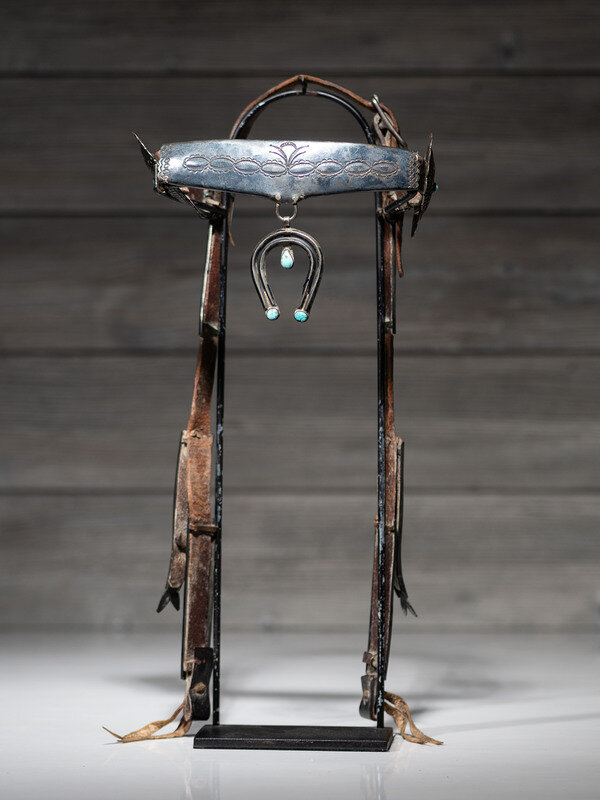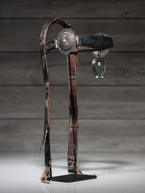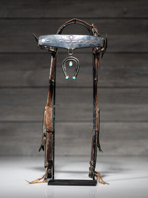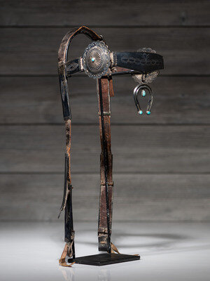 harness leather headstall encased with ten heavily stamped silver pieces along the browband and cheeks; double-wire naja pendant, set with three turquoise cabochons, hangs from the center of the browband and is likely a later addition