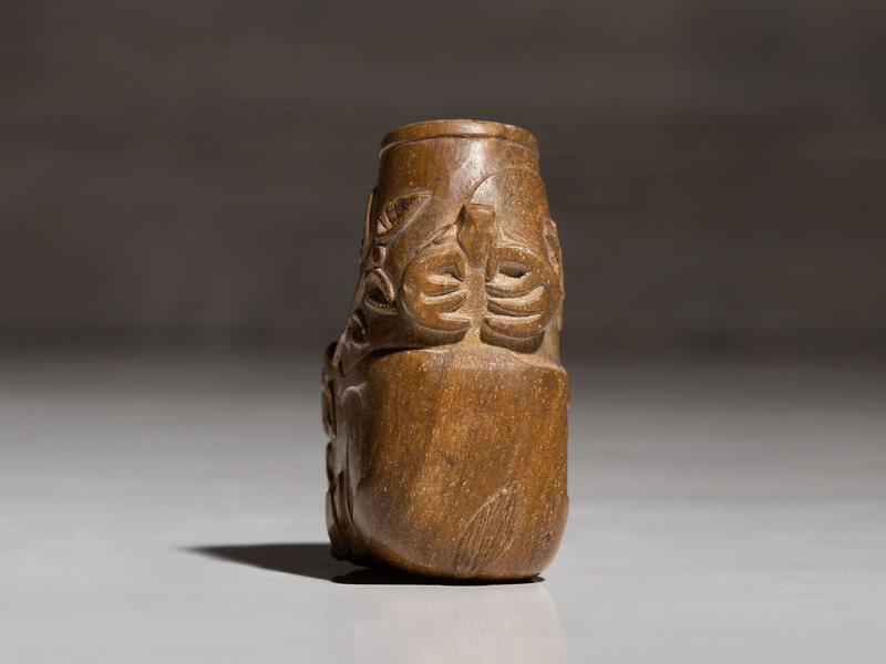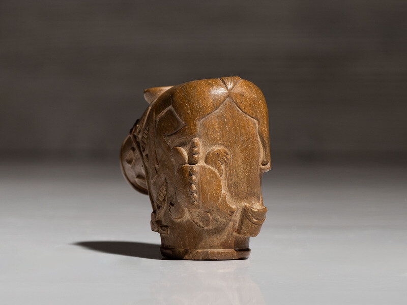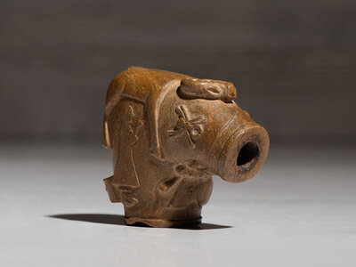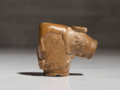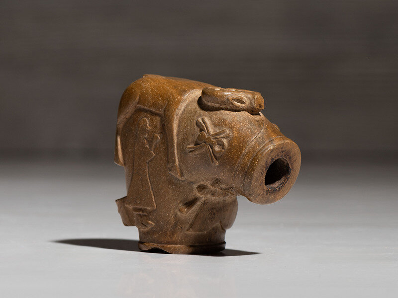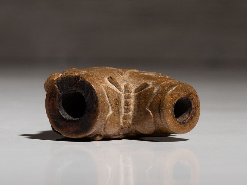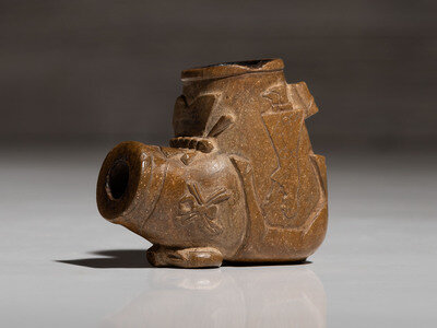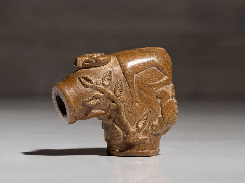 elbow-shaped bowl carved with imagery of a bull elk, turtle, butterfly, spider, and a woman carrying a bucket