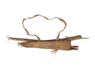 sinew-sewn and beaded with colors of white, dark blue, greasy yellow, and pea green; included is a bow, four wood bird darts and three arrows