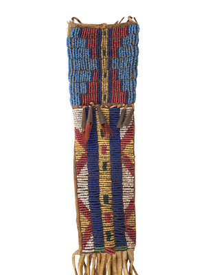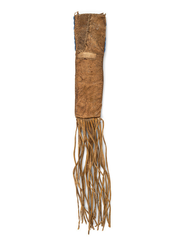 sinew-sewn and partially lined with rawhide; beaded geometric designs in colors of periwinkle, navy blue, red white-heart, greasy yellow, and white; lower edge with hide fringe lightly coated in yellow ochre