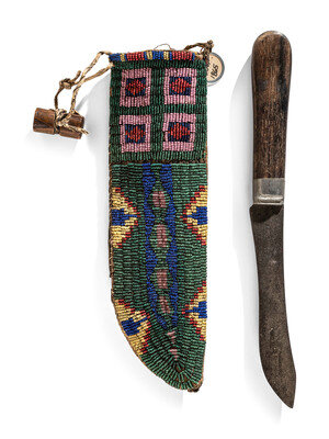 thread and sinew-sewn, with buffalo parfleche liner; beaded geometric designs in colors of translucent green, greasy pink, greasy yellow, navy blue, cobalt, and red white-heart; knife blade marked LANDERS FRARY & CLARK