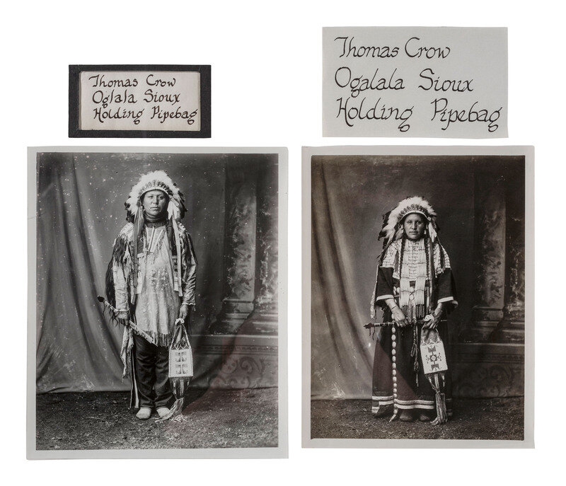 In 1904, Charles Carpenter photographed Thomas Crow and Nellie Jumping Eagle (1880-1939) holding this tobacco bag during the Louisiana Purchase Exposition in St. Louis, Missouri. Carpenter was hired as the Field Museum's first photographer (1899-1947), taking over 2000 images at the Exposition. (Images of Thomas Crow and Nellie Jumping Eagle holding this bag are archived within the Field Museum Library).