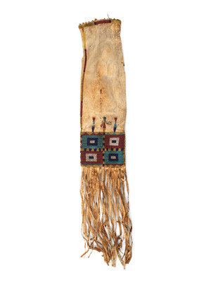 sinew-sewn; lower panel with geometric designs in colors of red white-heart, sky blue, navy blue, greasy yellow, and white; pinked upper edge with quill-wrapped hide thongs and tin cones; fringed lower edge