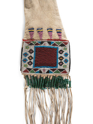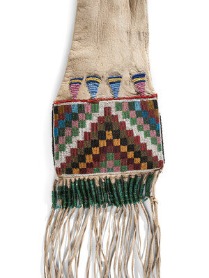thread and sinew-sewn softly tanned hide; beaded with an "open window" design on one side and checkered pattern on opposite