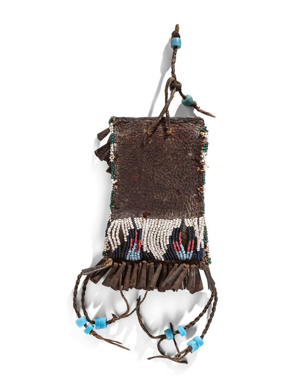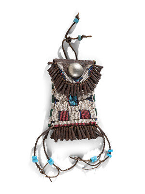 sinew-sewn and beaded using colors of red white-heart, cobalt, light blue, white, and translucent green; German silver domed button; tin cone fringe