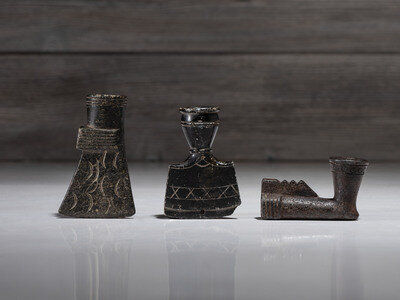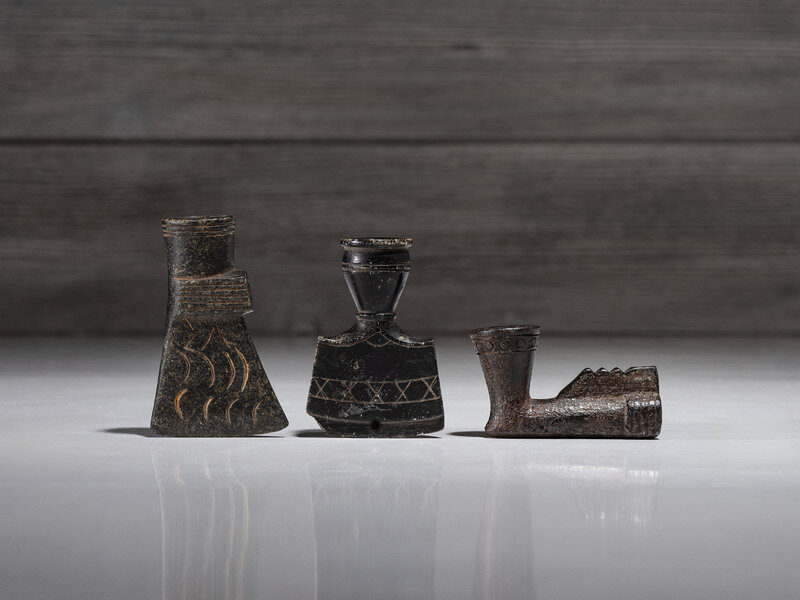 a steatite pipe bowl in the form of a tomahawk, 3-1/2 inches x width of blade 2 inches