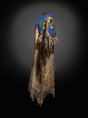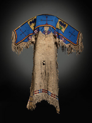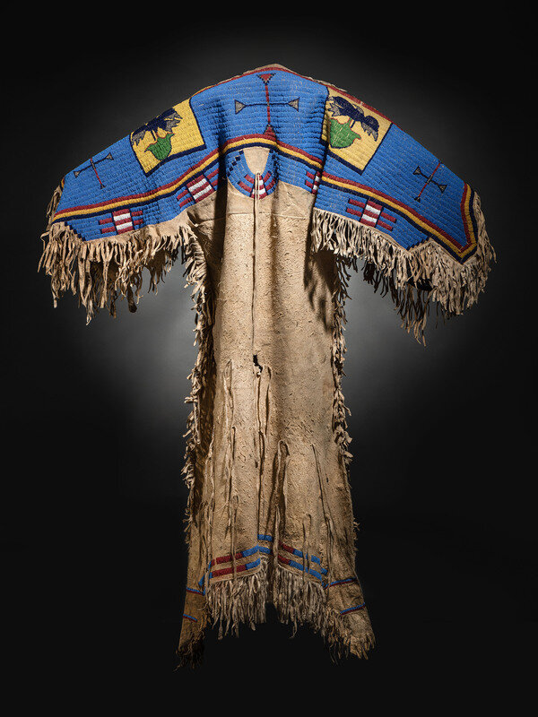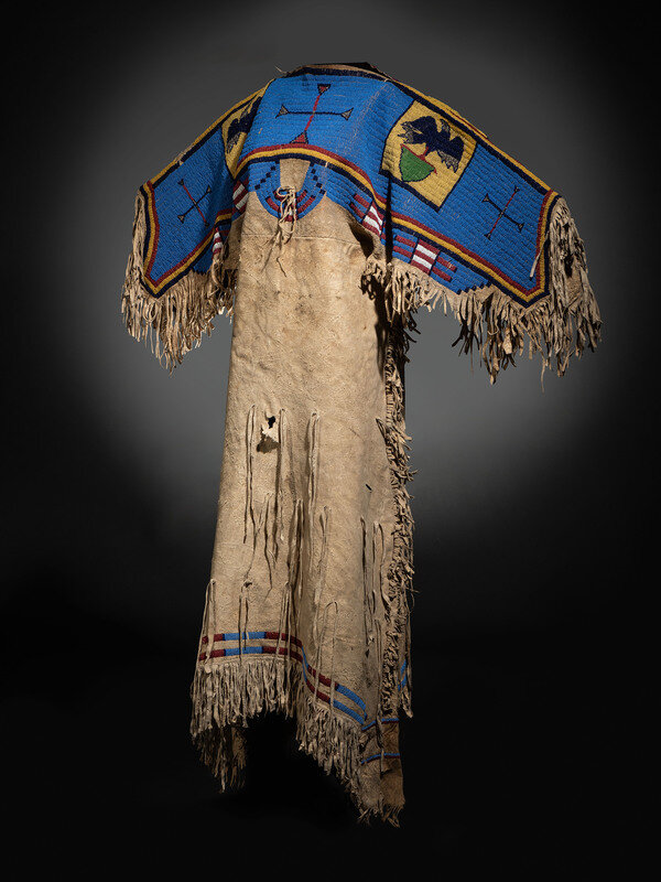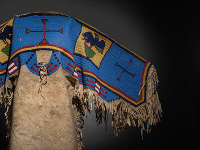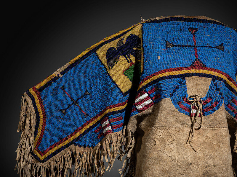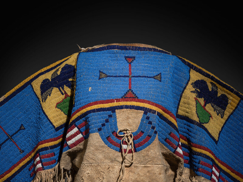 sinew-sewn and beaded using colors of red white-heart, medium and dark blue, greasy yellow, white, pea green, and marcasite; yoke designed with crosses and American eagles with modified US shields