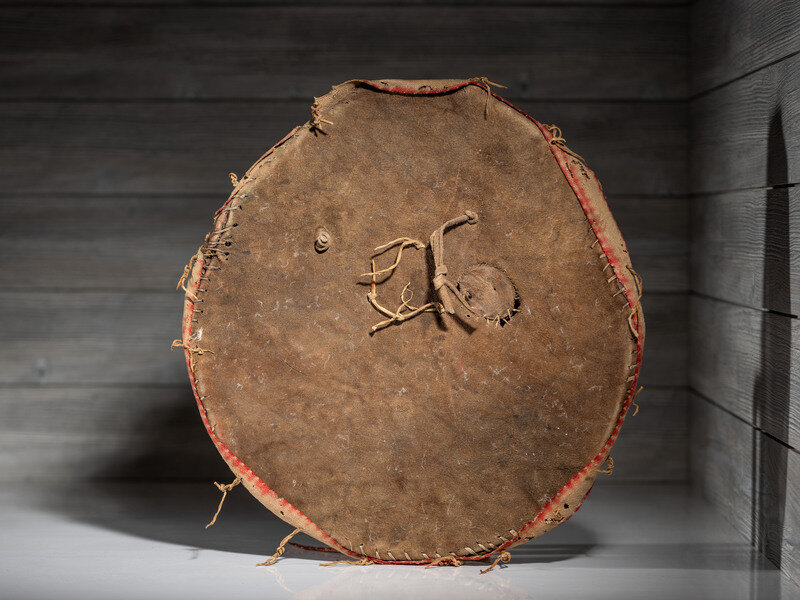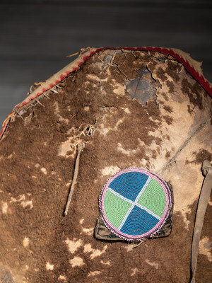 cover made of buffalo hide with hair still attached; the center fixed with a beaded medallion in colors of pea green, greasy pink, light blue, and translucent blue and backed with black velveteen; the outer edges lined with a cream and red stroud; buffalo hide shield is tightly fastened within the cover
