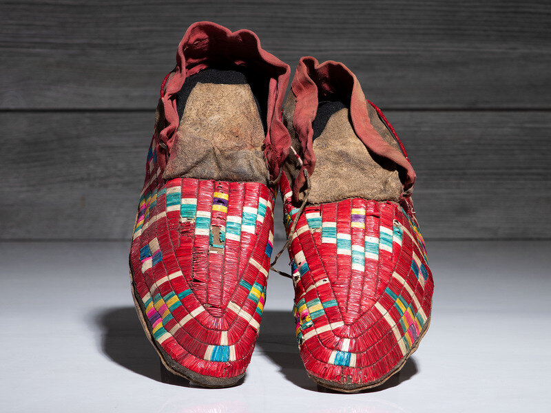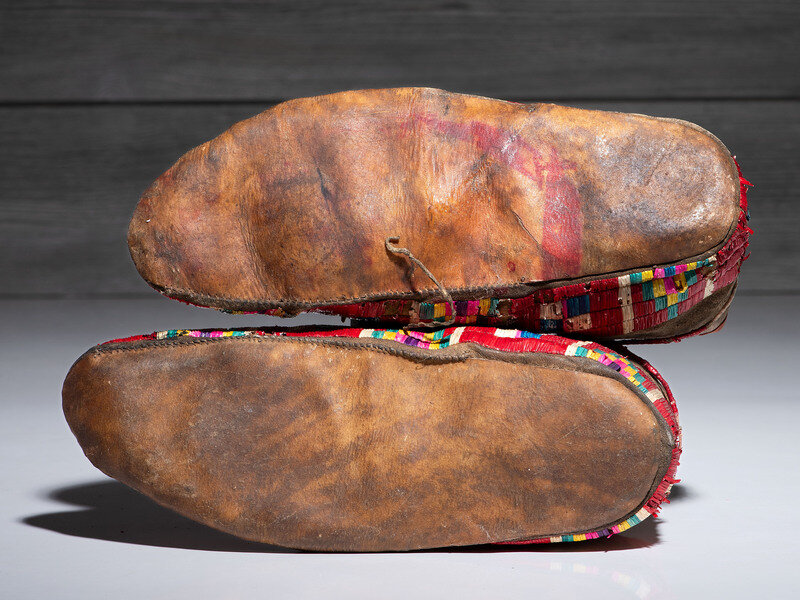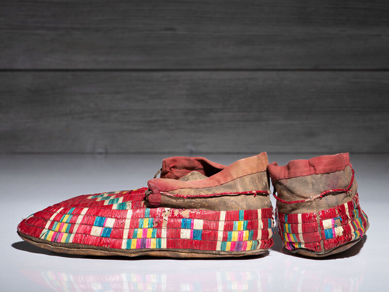 thread and sinew-sewn with brightly quilled geometric design; cotton cuffs