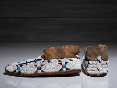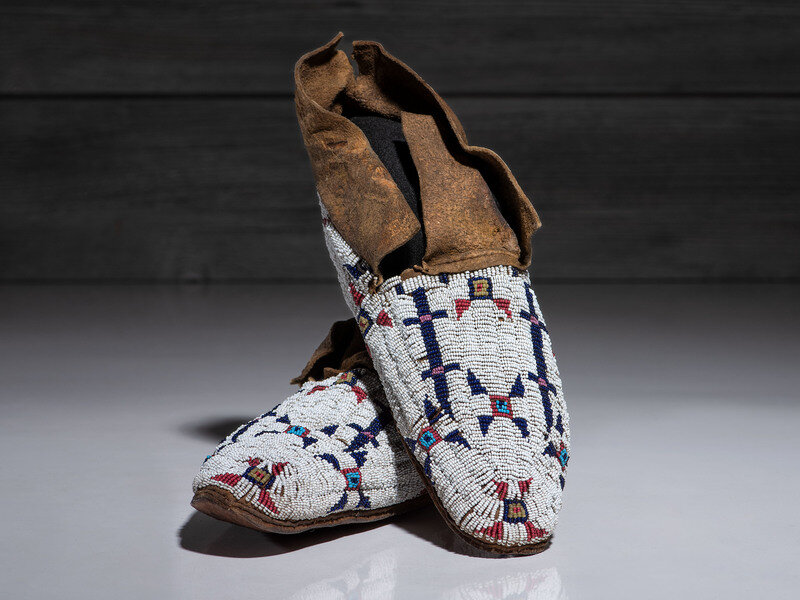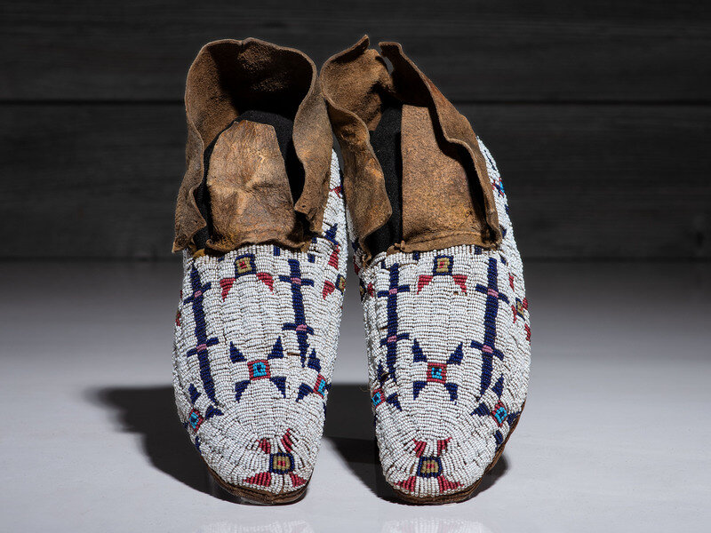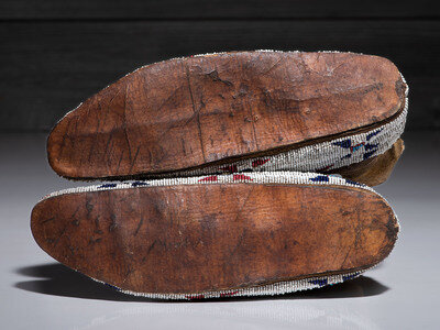 sinew-sewn and with beaded geometric designs in colors of cobalt, red white-heart, sky blue, and greasy yellow against a white ground