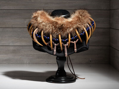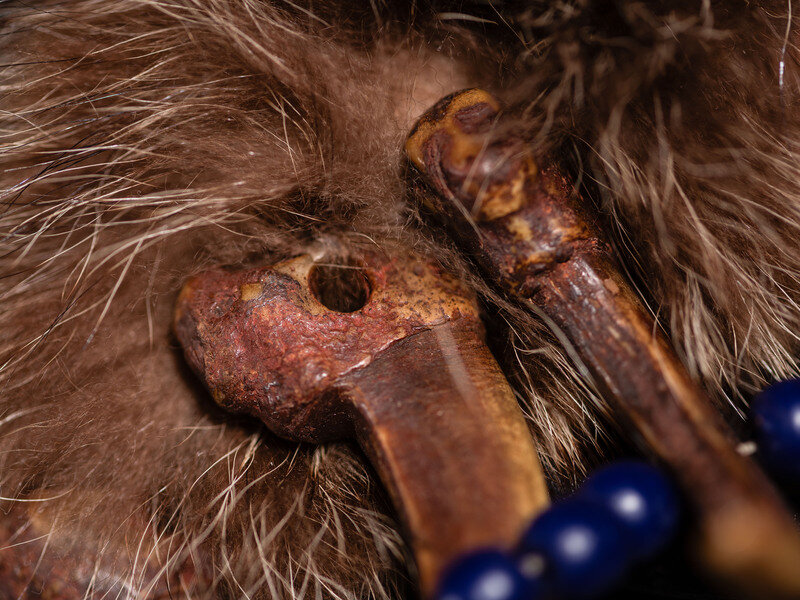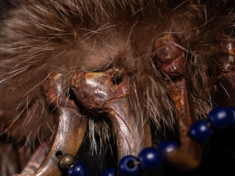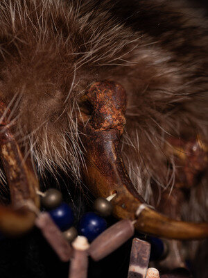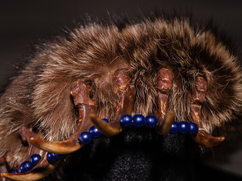 constructed with 19 golden claws coated with red pigment; claw lengths range from 3-1/2 to 4 inches; restrung with cobalt beads and sea urchin spines