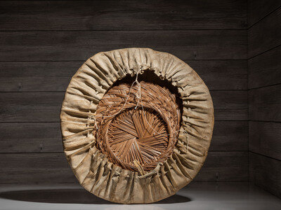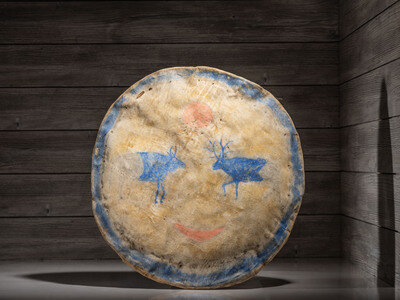 painted in blue, yellow, and orange depicting an elk, buffalo, sun and moon; gathered in the back with hide thong; hide pierced for attachments
