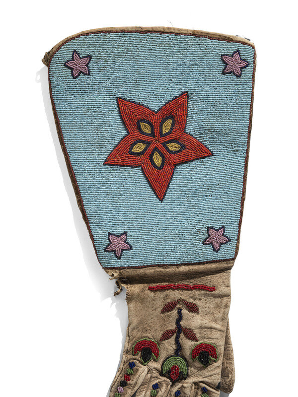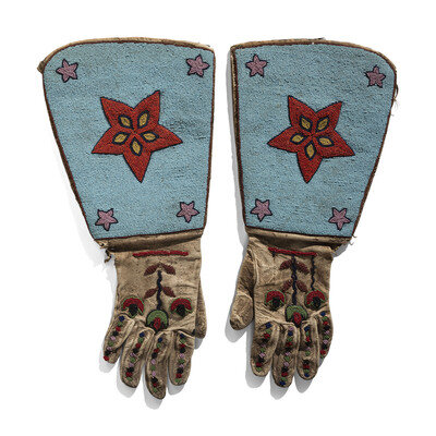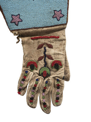 thread and sinew-sewn with beadwork in colors of light and dark blue, apple red white-heart, pink, cobalt, and faceted red; flowers on the back of hand and stars on the cuff; linen lined