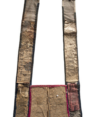 thread-sewn on canvas and beaded using an assortment of colors on red trade wool; martingale is stabilized using scraps of cardstock from various establishments in Montana, including the New Fallon Hotel and Northwest Fixture Company, Billings