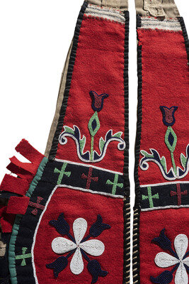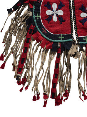 thread-sewn and beaded with flowers on red wool using colors of red white-heart, white, pea green, and cobalt; hide fringe with red wool tabs; backed with canvas