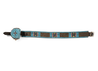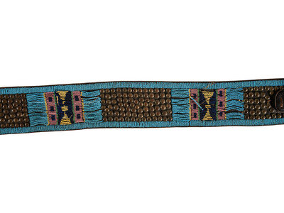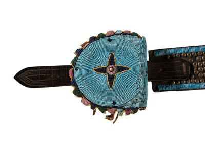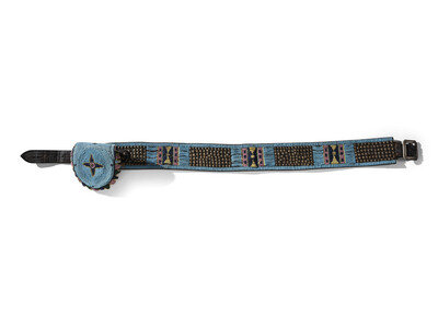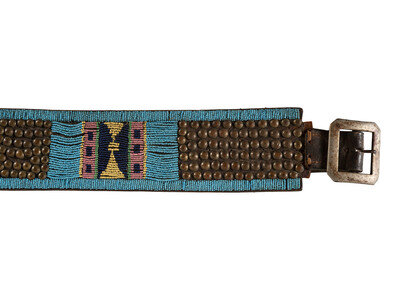 sinew-sewn on harness leather and beaded in colors of cobalt, greasy pink, greasy yellow, and pea green against a sky blue ground; the belt with four clusters of brass tacks