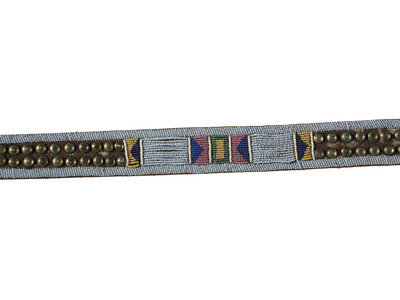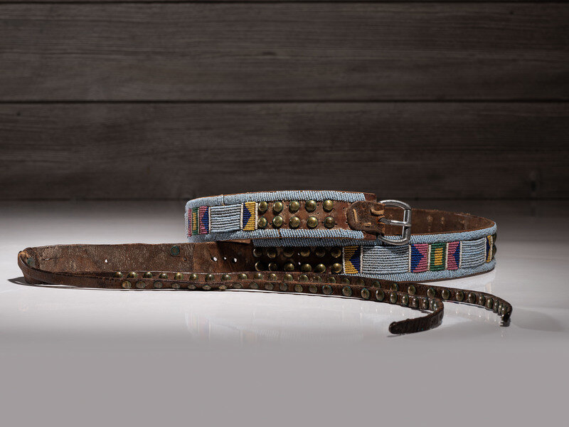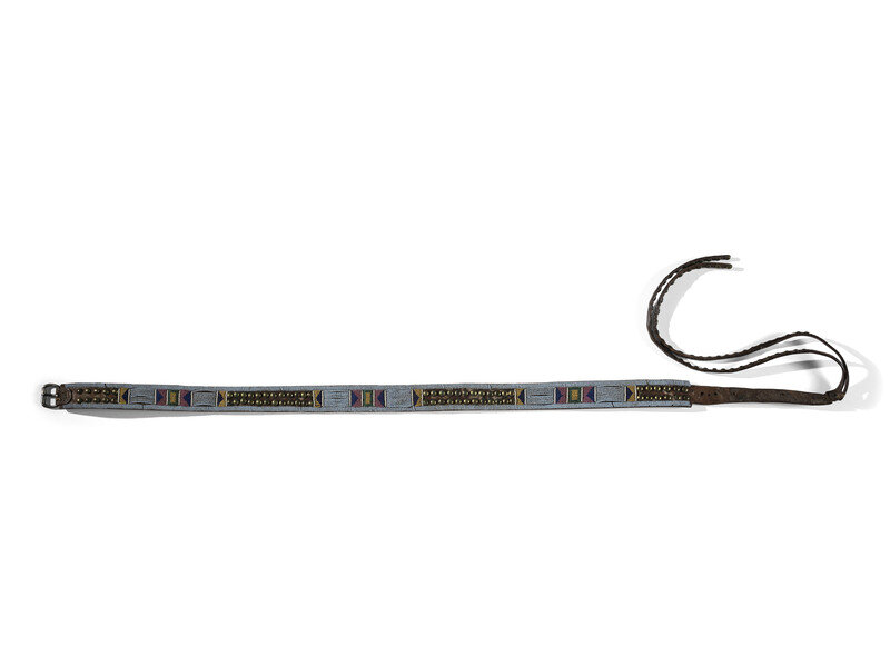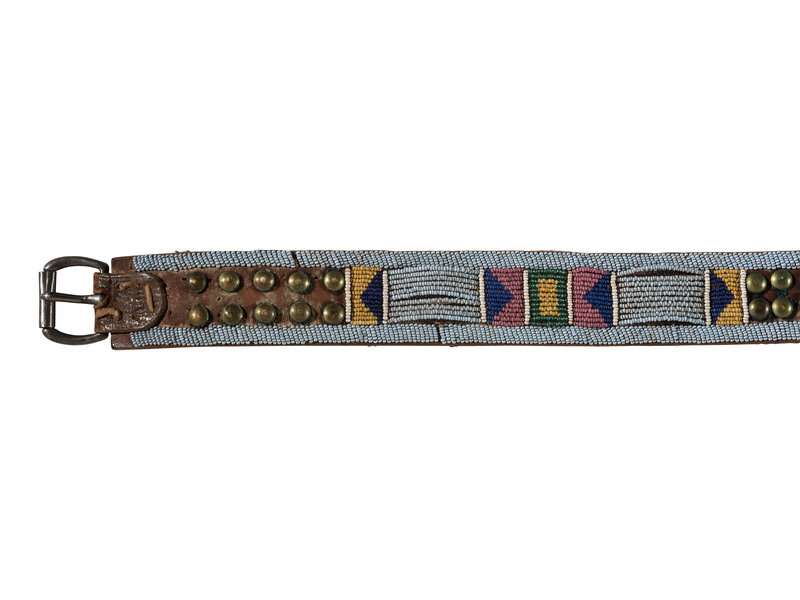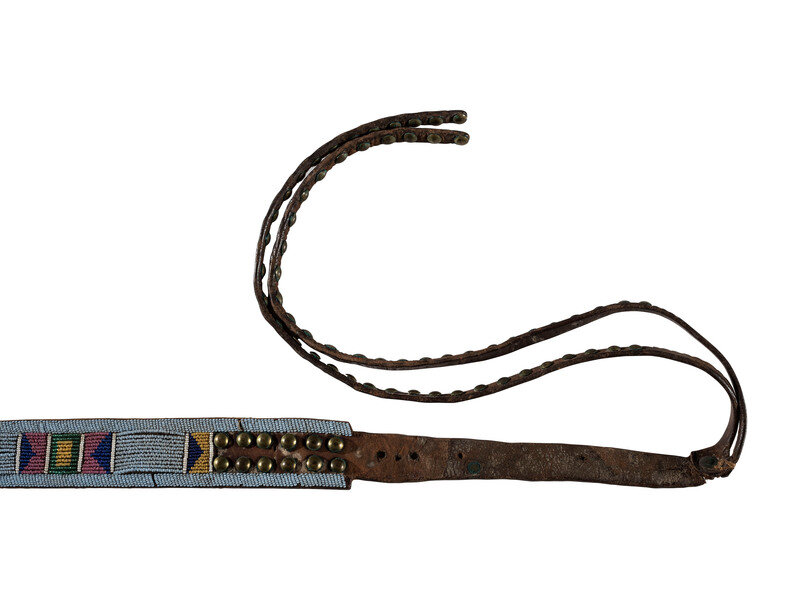 sinew-sewn and beaded in colors of light blue, dark blue, pink, greasy yellow, and white; brass tacks stud the belt and double drops