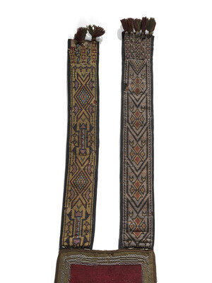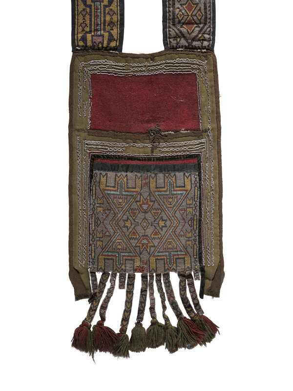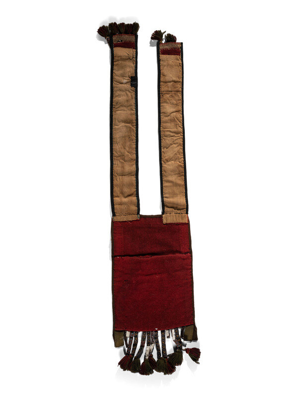 thread-sewn on red and green wool; edged with black cotton and velvet; geometric design decorates the lower panel and mirroring straps feature thunderbirds and abstract floral elements