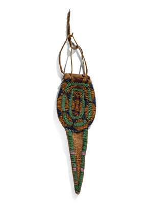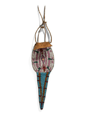thick, softly tanned hide in an unusual turtle-like form; sinew-sewn and beaded on both sides using colors of pink, red white-heart, white, translucent green light blue, amber, rose, cobalt, and pea green