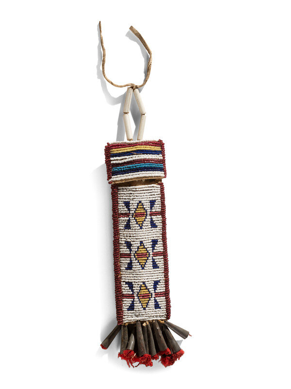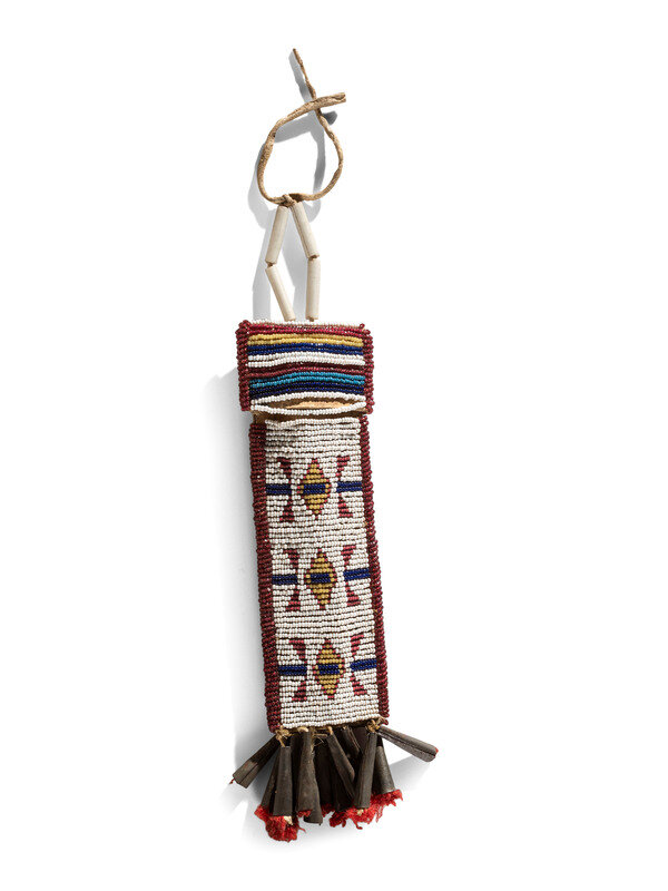 sinew-sewn and beaded on a parfleche base using colors of faceted rose, red white-heart, faceted cobalt, greasy yellow, and white; tin cone fringe filled with red wool