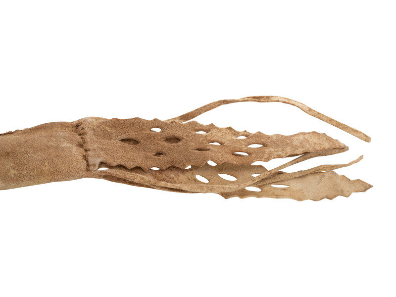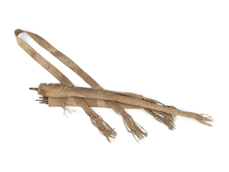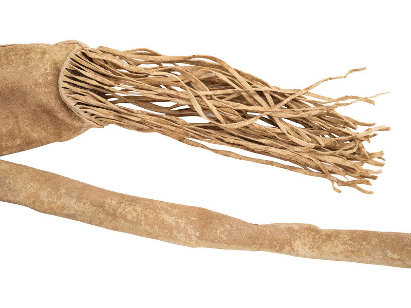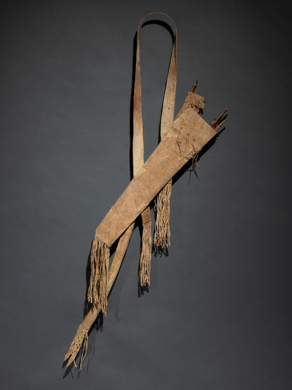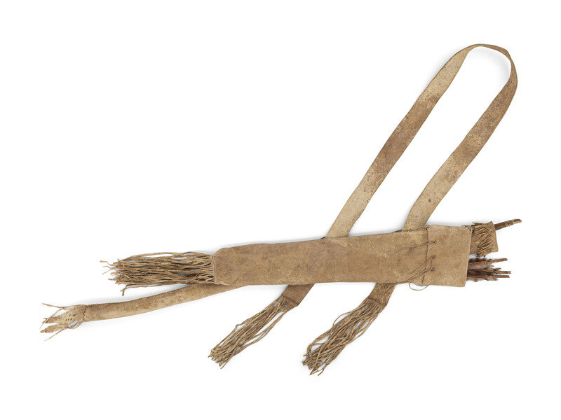 sinew-sewn on softly tanned buffalo hide; hide fringe cascades from edges; hide tabs with cutouts decorate the lower seam of the bowcase