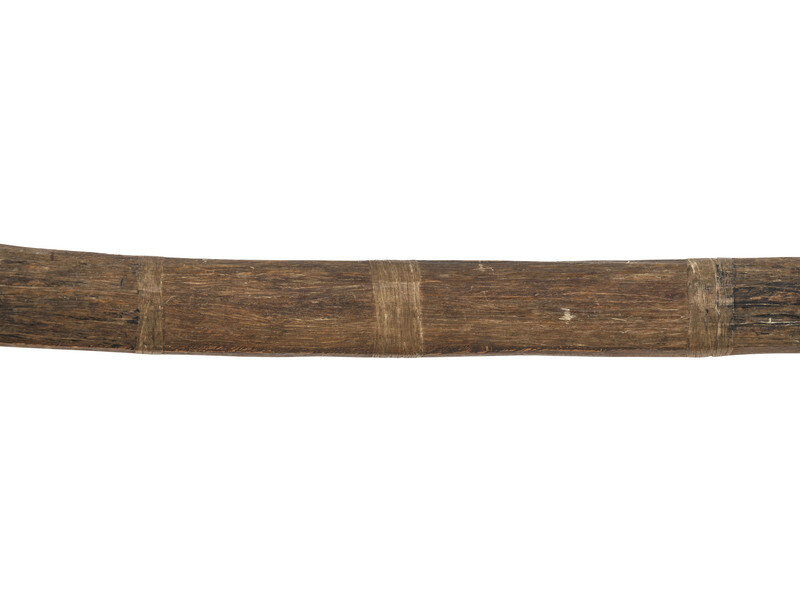 sinew-backed recurve bow with remnants of black/blue paint highlighting the sinew side