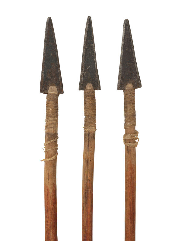 three metal-tipped arrows coated in red pigment
