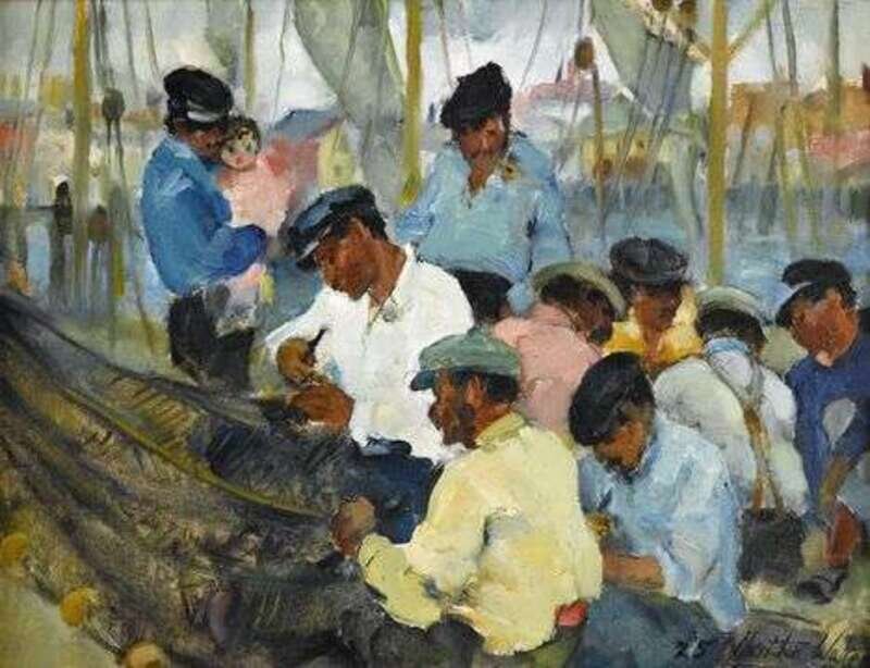 MARTHA WALTER (AMERICAN 1875-1976) "MENDING NETS ON ITALIAN DOCKS, GLOUCESTER"