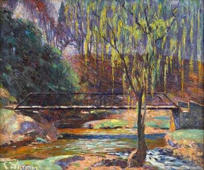 CLARENCE RAYMOND JOHNSON (AMERCIAN 1894-1981) A SUNLIT FOOTBRIDGE