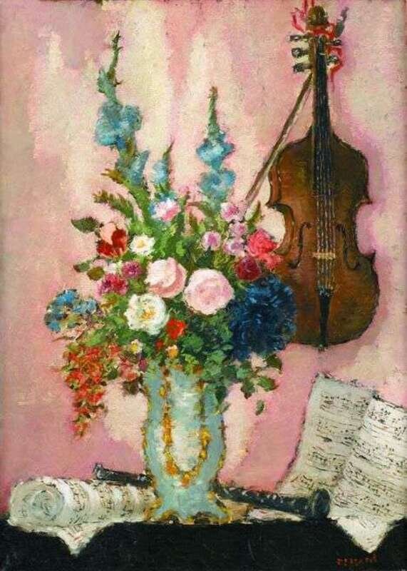 DIETZ EDZARD (GERMAN 1893-1963) STILL LIFE WITH VASE OF FLOWERS, VIOLIN AND OBOE