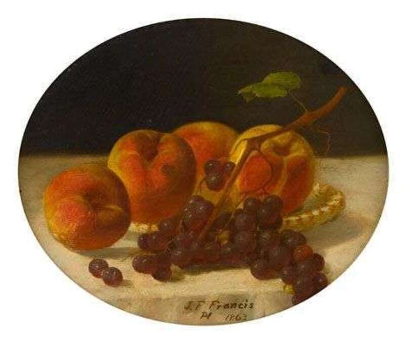 JOHN F. FRANCIS (AMERICAN 1808-1886)PAIR OILS ON PANEL STILL LIFE OF PEACHES AND GRAPES