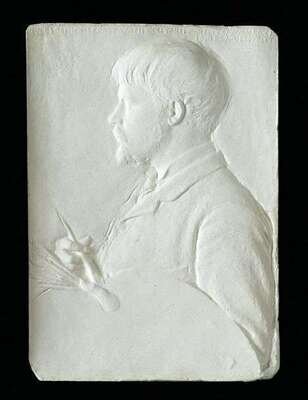With inscription 'JULES-BASTIEN-LEPAGE-AETATIS.XXXI.PARIS.M.D.C.C.C.LXXX.AUGUSTUS./SAINT-GAUDENS.FECIT', plaster relief cast, in a shadowbox frame with green velvet liner