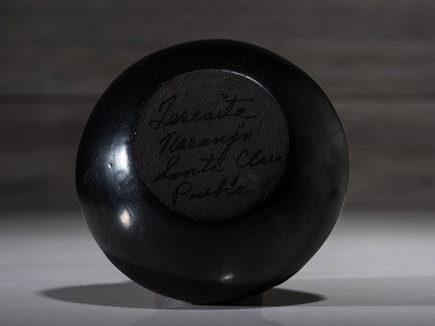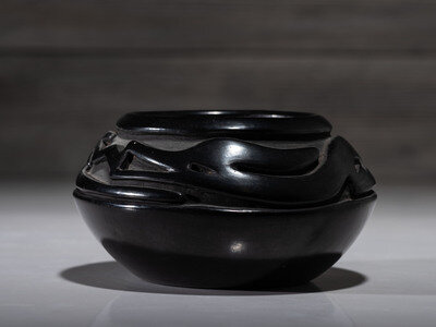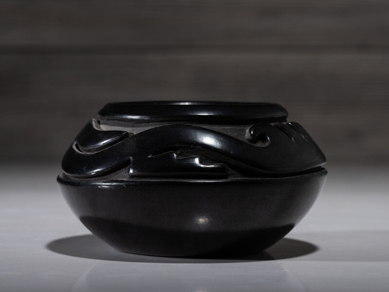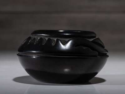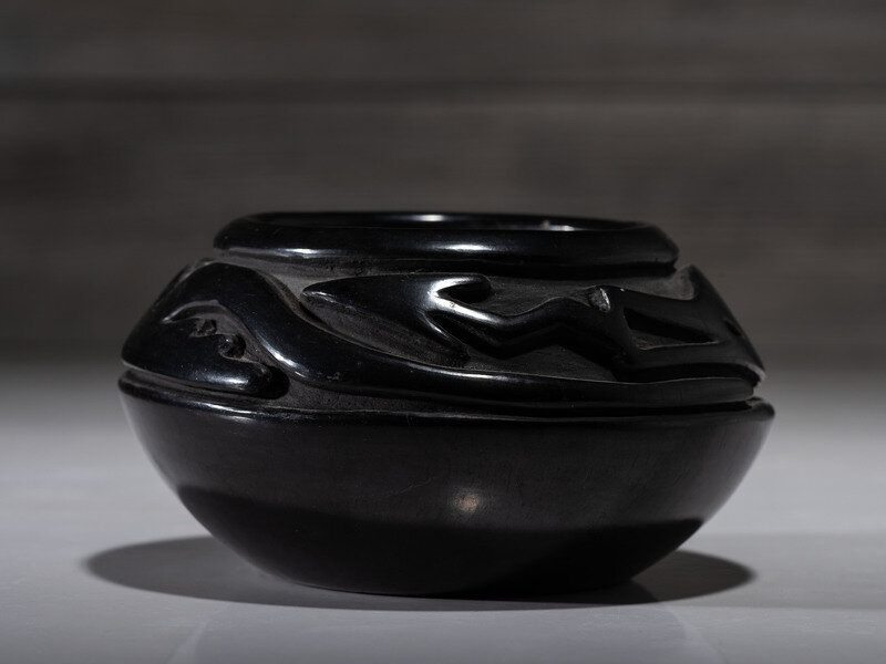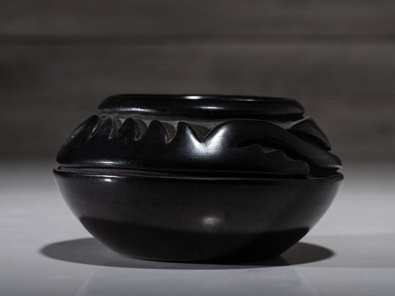 deeply carved with Avanyu around shoulder; signed on base