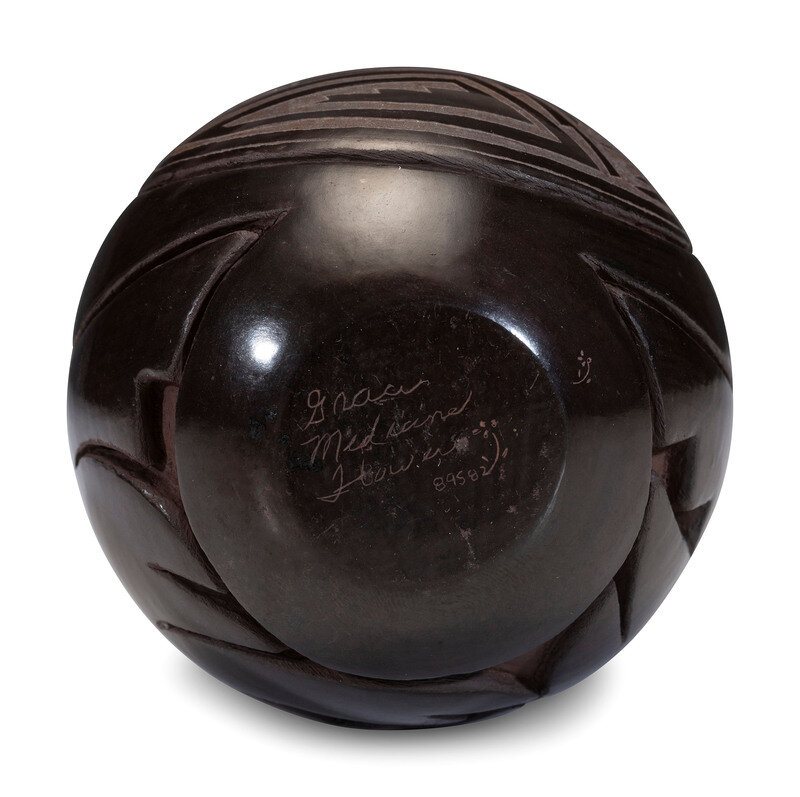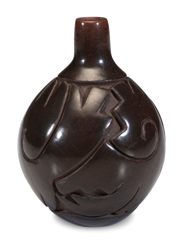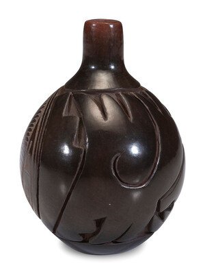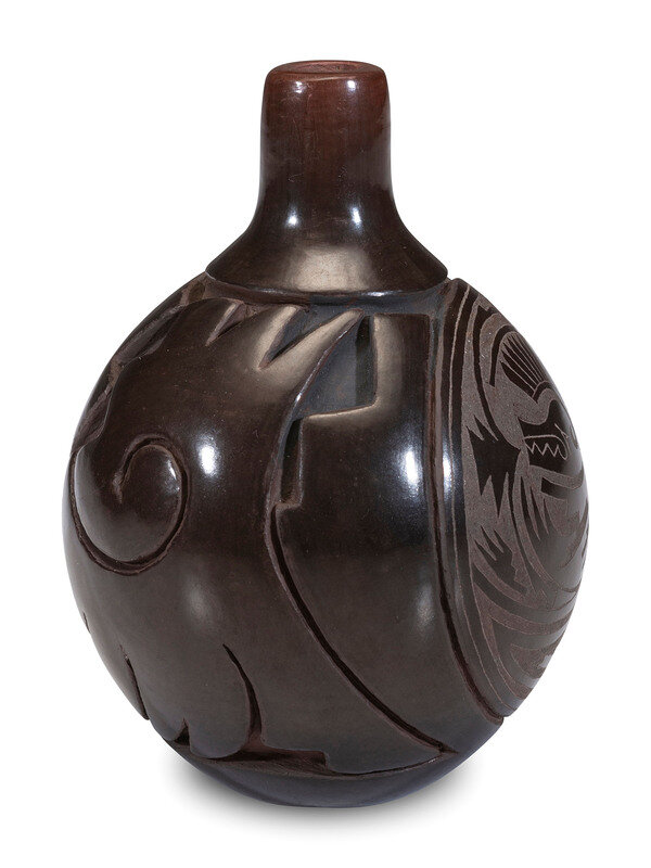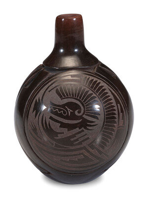 two-toned black to siena jar with sgraffito Avanyu and repeating feather design; signed on base