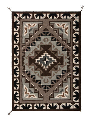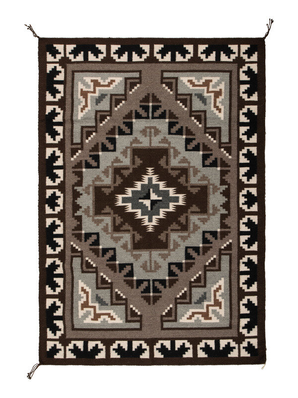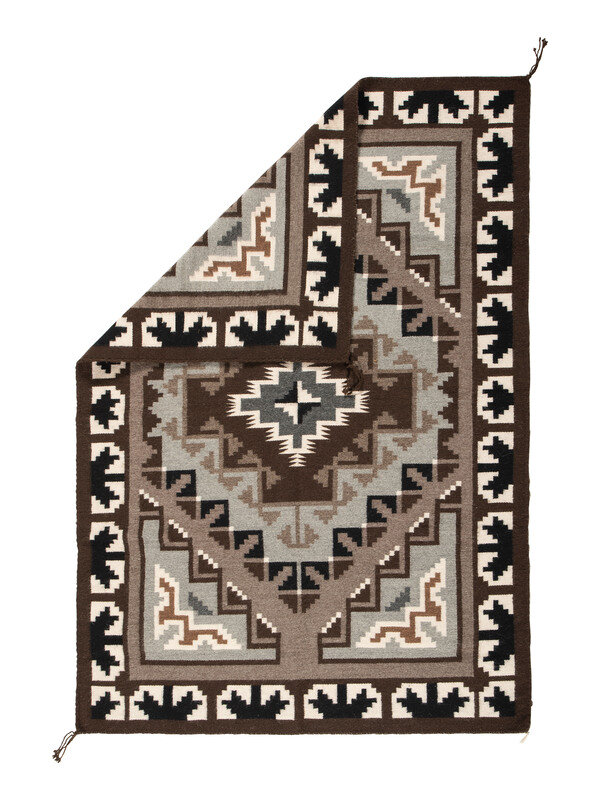 handspun wool woven in dark browns, gray, and cream; central diamond is surrounded by a stepped border