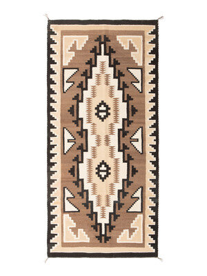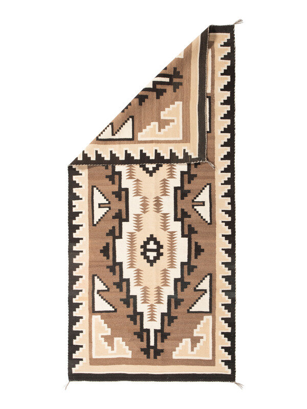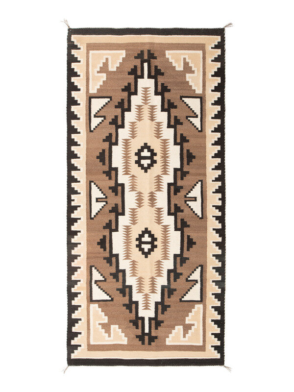woven in colors of brown, tan, cream, and black with elongated central diamond