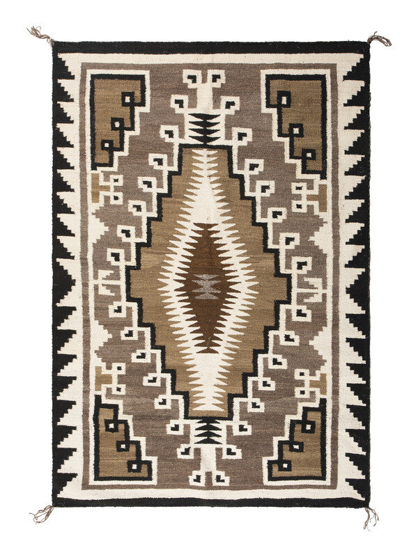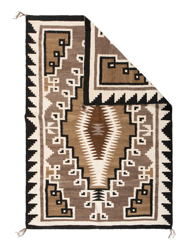 handspun wool woven in natural colors of cream, gray, khaki, and black; central elongated diamond