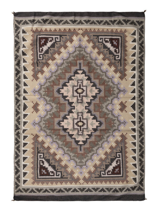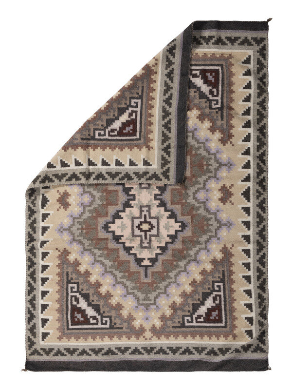 finely woven in colors of grays, browns, lilac, and mossy green; with a traditional terraced design of central double-stacked diamond