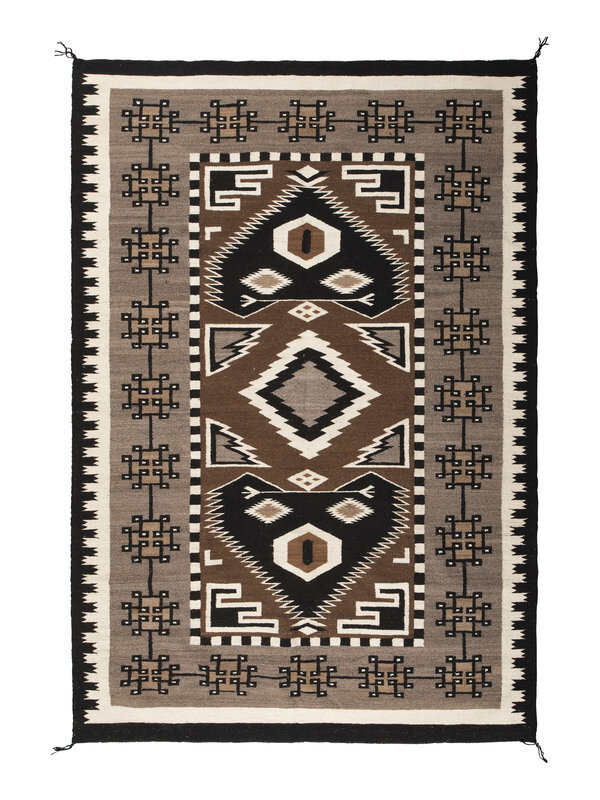 thick, handspun wool woven in natural colors of browns, black, and cream; wide border surrounds double outlined spades and central diamond