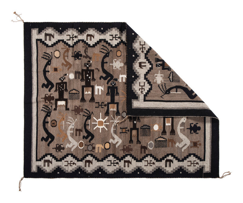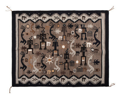 woven with a whimsical design using natural handspun wool; kokopelli, yei figures, lizards, deer, rainclouds, and suns fill the textile; Toadlena Trading Post tag notes Gallup Third Place Award Winner, 2006