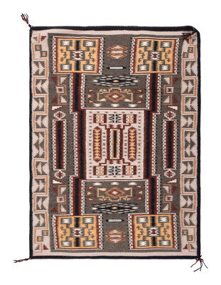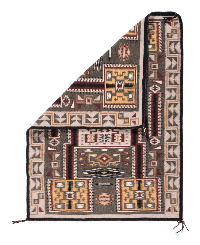 handspun wool finely woven using soft colors to create an intricate design of a busy storm; photograph of weaver with this textile is included