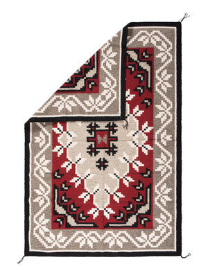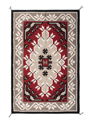 handspun wool woven with a wintry design of a central diamond surrounded by a gray and white florally inspired border