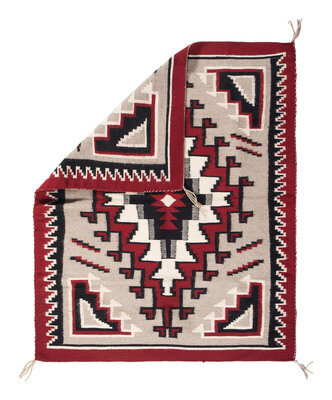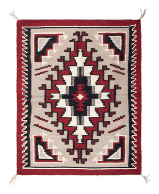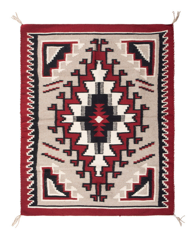 handspun wool woven in red, cream, black, and gray; with central stepped diamond and triangular anchor points; Ortega tag with artist attribution included