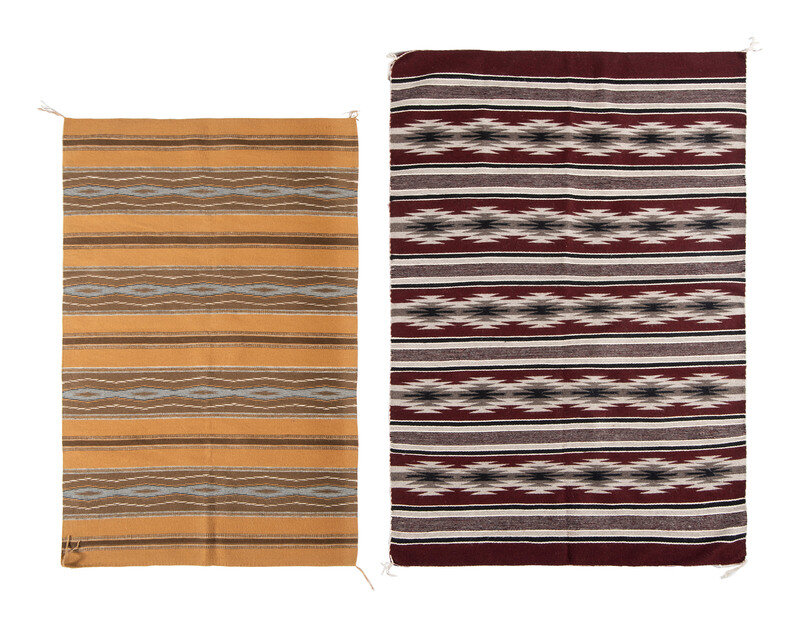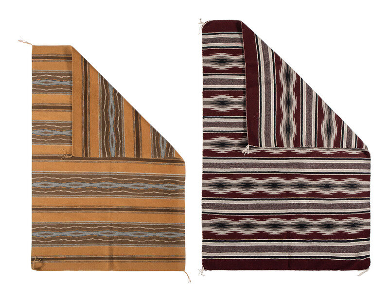 a weaving by Marleen Begay; handspun wool with a banded design in cream, rust, and browns