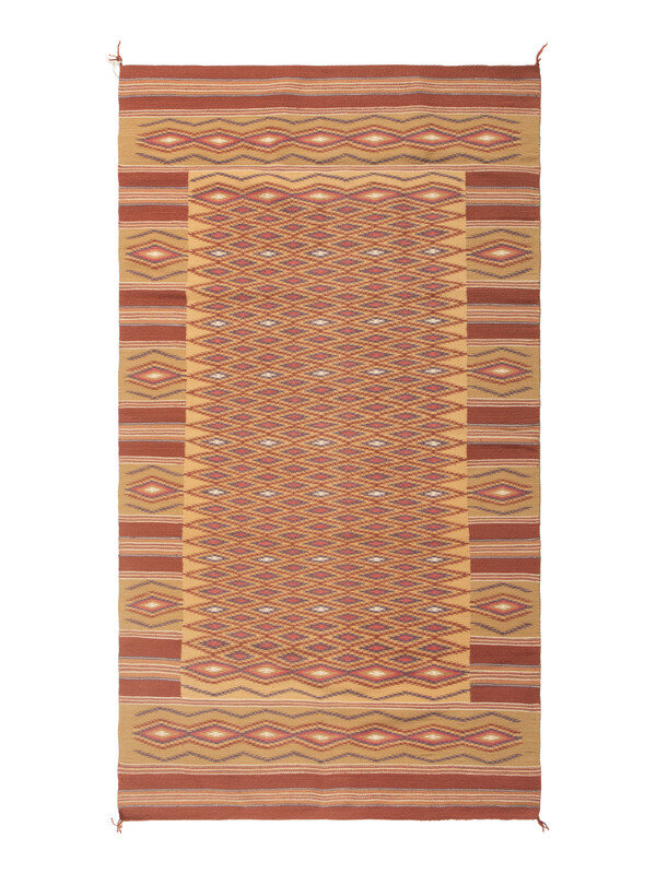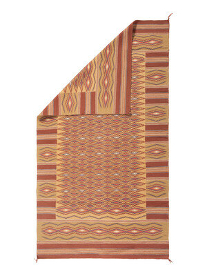 finely woven using soft colors of yellows, gray, pink, and purple; busy eye-dazzling center is surrounded by a horizontally banded border