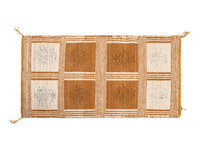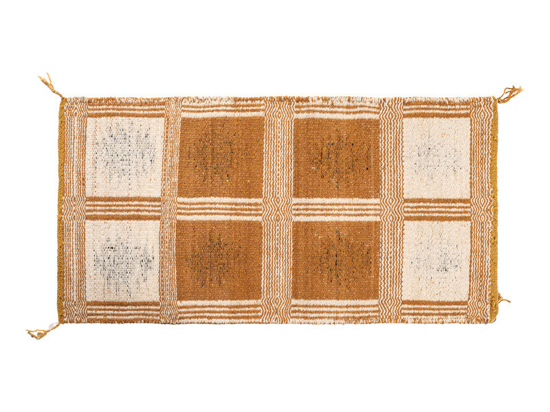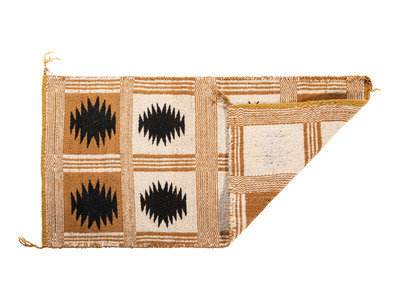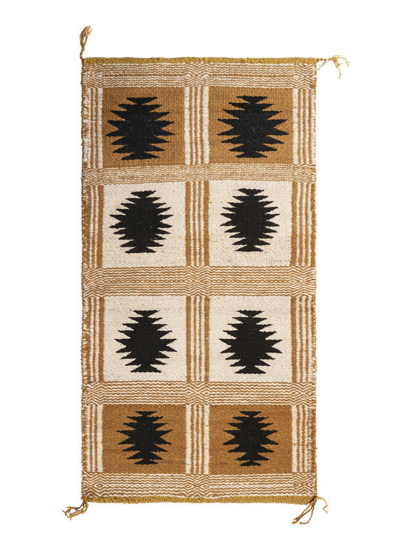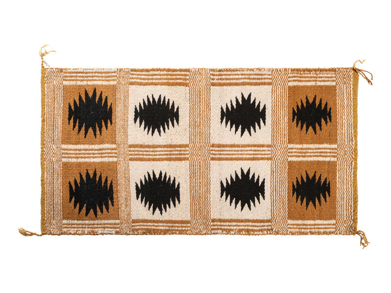 thick, handspun wool woven with a twill and diamond twill weave; one side having a box design while opposite has squash blossoms
